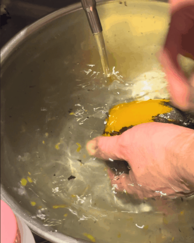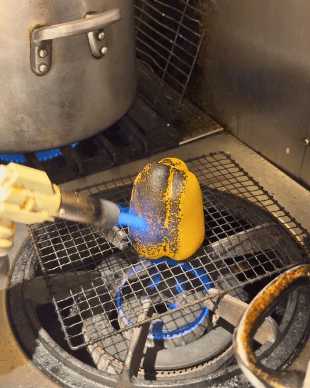 ガスバーナーで炙り、薄皮をむきやすくします。